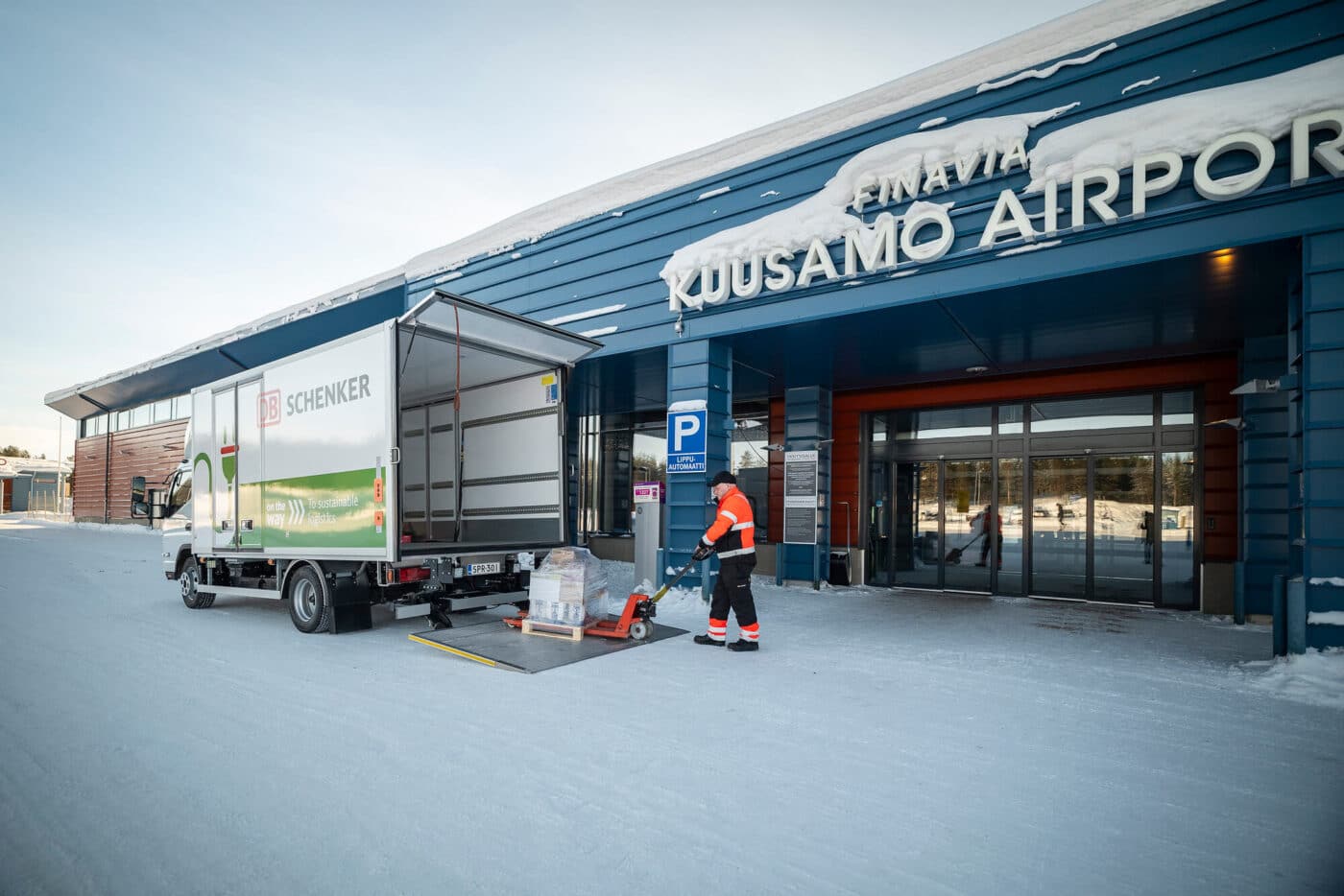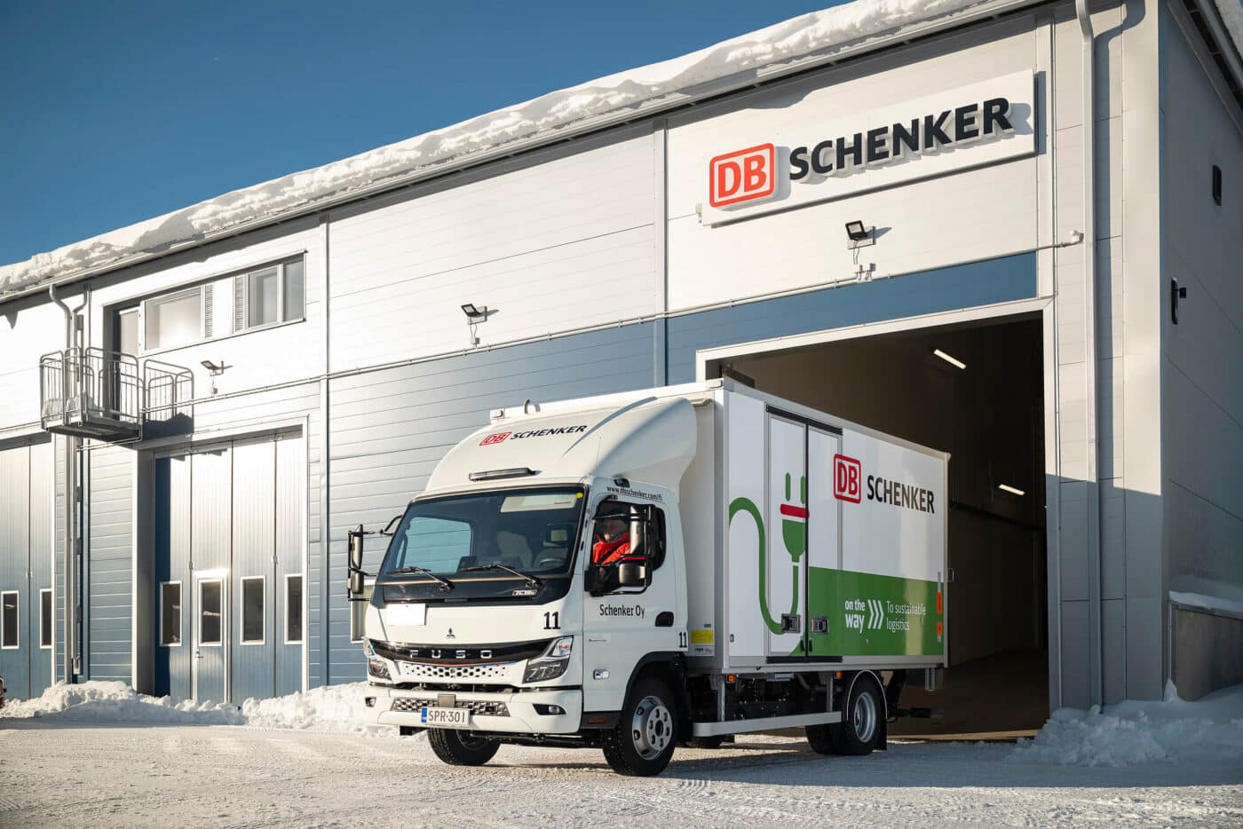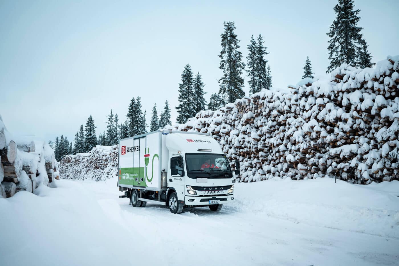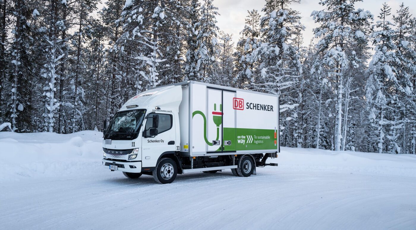 The snow piles up man-high to the left and right of the icy roads and it’s chilling cold when Raino Mourujärvi, Head of Terminal Area at DB Schenker Northern Finland, arrives at the DB Schenker site in Kuusamo. The passionate logistics specialist is visibly delighted, as he is on his way today to visit his latest “project”. In the far northeast of Finland, where the first snow often falls in October and then stays until the end of April. where temperatures of up to minus 30 degrees Celsius were already visible on the thermometer this winter. This is precisely where DB Schenker has been deploying a FUSO Next Generation eCanter 7.49 T for city deliveries since mid-January this year.