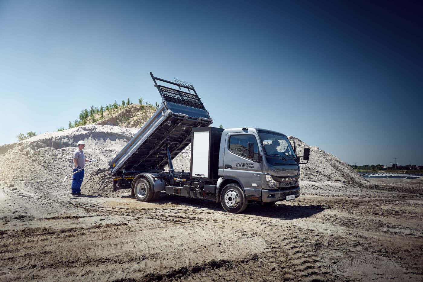 Das zweite ausgestellte Fahrzeugmodell ist ein konventionell angetriebener Canter 6S15 in cleanem Naturweiß. Mit einem Pritschenaufbau von WEHA inklusive Ladekran präsentiert er eine weitere typische Einsatzmöglichkeit des Leicht-Lkw im Baugewerbe. Den besonders kompakten 6-Tonner stattet FUSO ab Werk mit der schmalen und leichten Standard-Einzelkabine aus, die bei nur 1,7 m Breite dennoch drei vollwertige Sitzplätze bietet. Mit einer Gesamtlänge von 5.200 mm, einer Breite von 2.200 mm und einer Höhe von 2.137 mm macht der Canter in der gezeigten Variante trotz seines Aufbaus eine schlanke Figur. Er ist für den Fahrer ausgezeichnet zu überblicken und ausgesprochen wendig. Der ideale Partner für anspruchsvolle Einsätze mit schweren Lasten auf engen Fahrwegen.